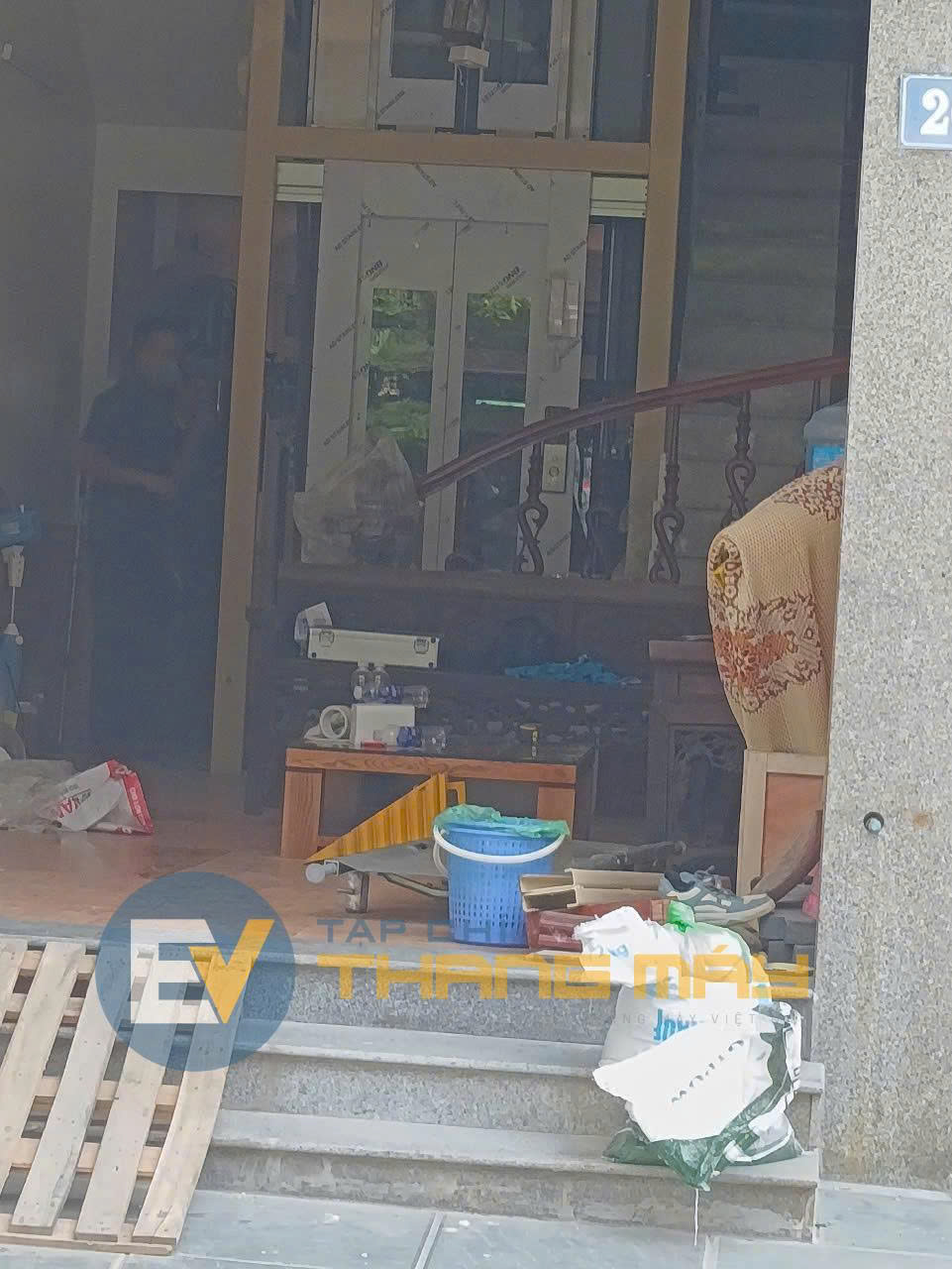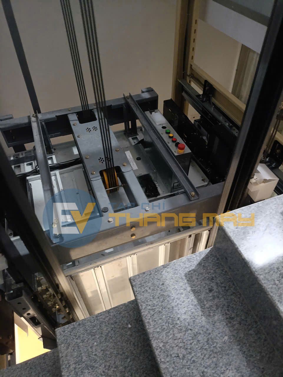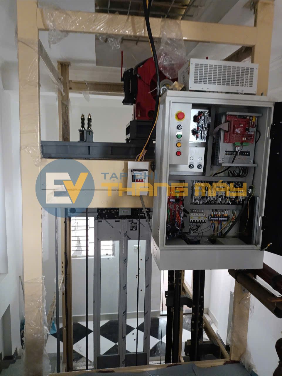 Images from the scene show an elevator under installation, with the shaft left exposed.