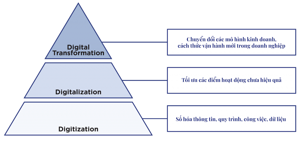 Chuyển đổi số (Digital Transfomation) là giai đoạn các hệ thống kinh doanh, quản trị của doanh nghiệp được kết nối và tích hợp đồng bộ với nhau. Thông tin chia sẻ xuyên suốt giữa các phòng ban và theo thời gian thực. Ở giai đoạn này, doanh nghiệp bắt đầu đầu tư nhiều vào các sáng kiến để tạo ra sự đổi mới, sáng tạo nhằm tạo ra các giá trị mới và bứt phá.