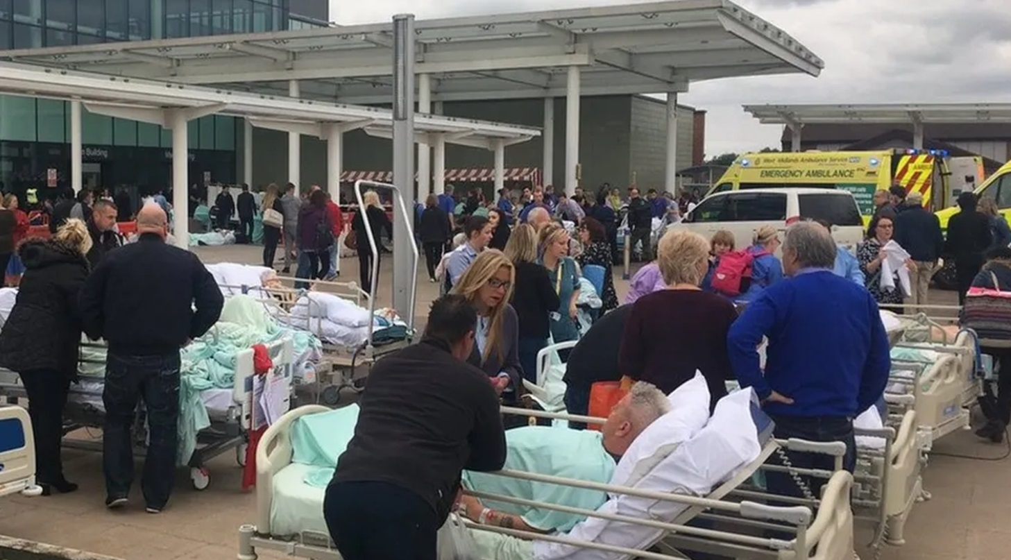 Patients being evacuated from the building in the Royal Stoke Hospital fire in July 2017 (UK)
