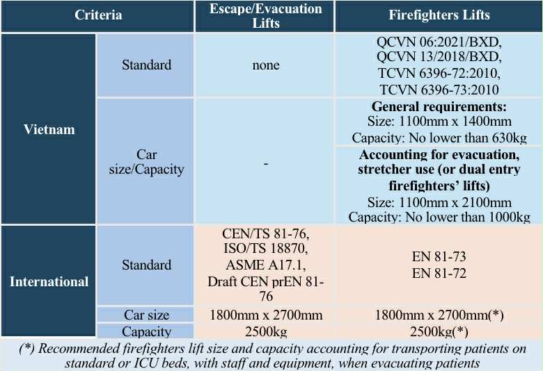 In addition to horizontal evacuation to adjacent areas, despite the dangers of moving these patients, there must still be an option for vertical evacuation (to lower floors or outside) as a last resort, along with appropriate measures to minimize risks. As such, when designing a firefighters or evacuation lift system, it is necessary to pay attention to the size and capacity suitable for these patients.