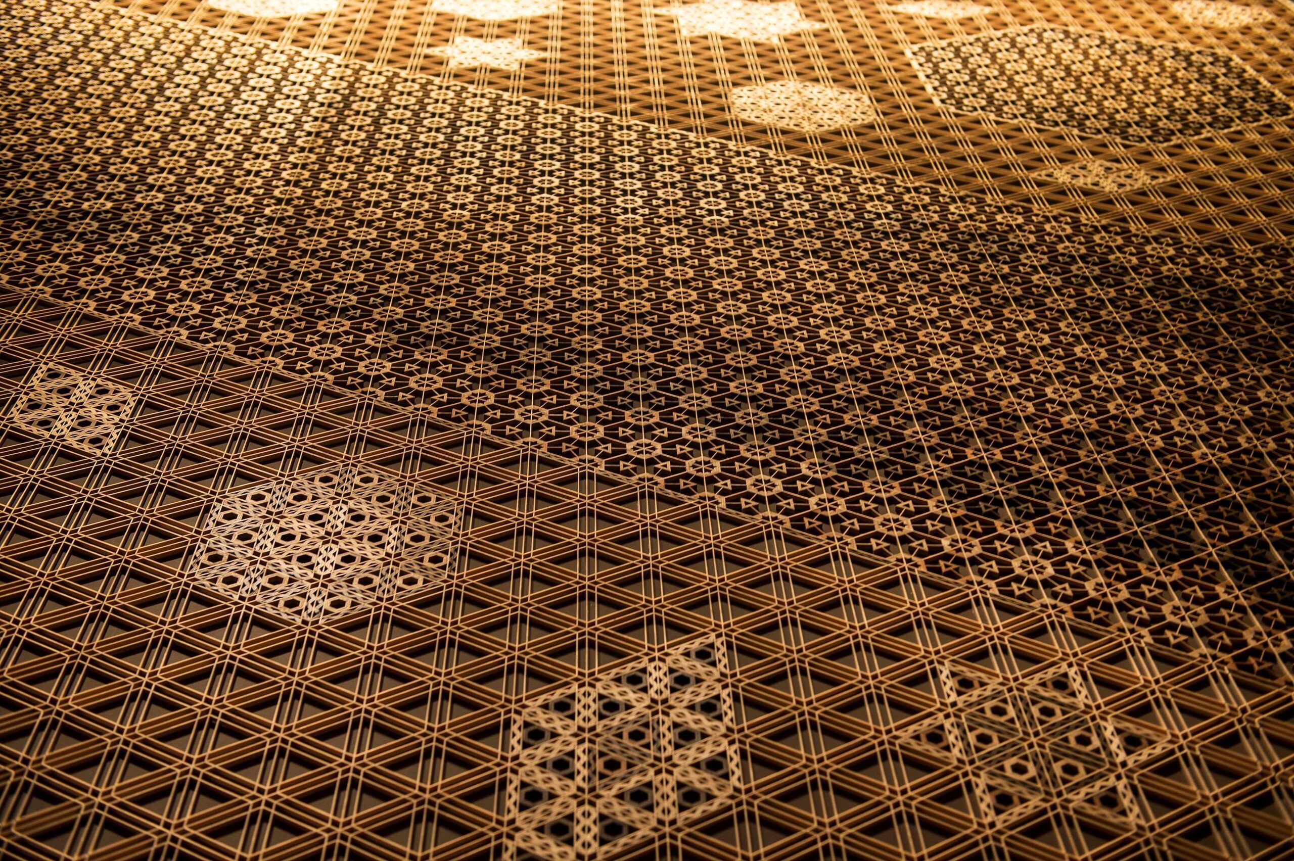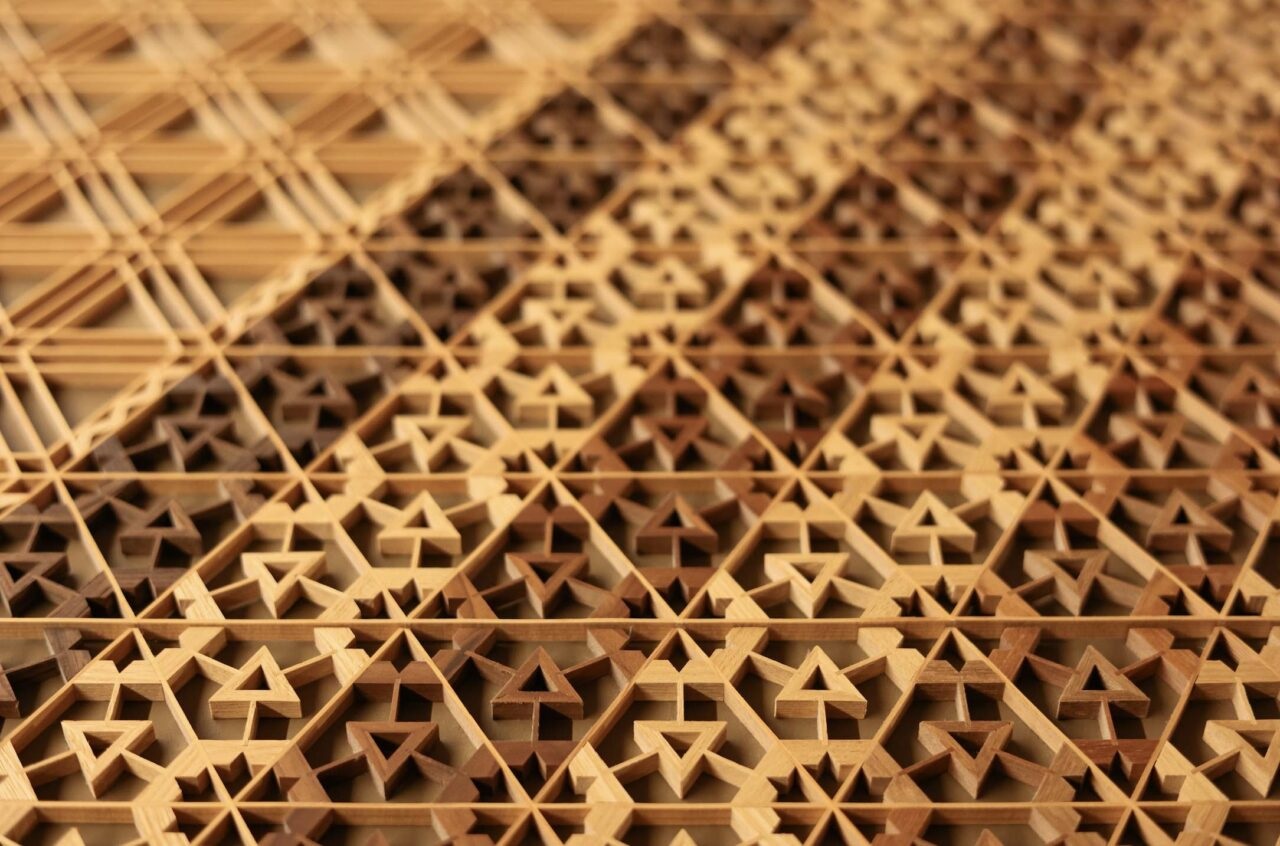 Employing the kumiko woodworking technique, Kotaka meticulously assembled thousands of pieces of wood into intricate geometric patterns - without using nails, staples, or glue. Kumiko, a Japanese woodworking heritage dating back to the Asuka period, relies on precision joinery and interlocking grooves.