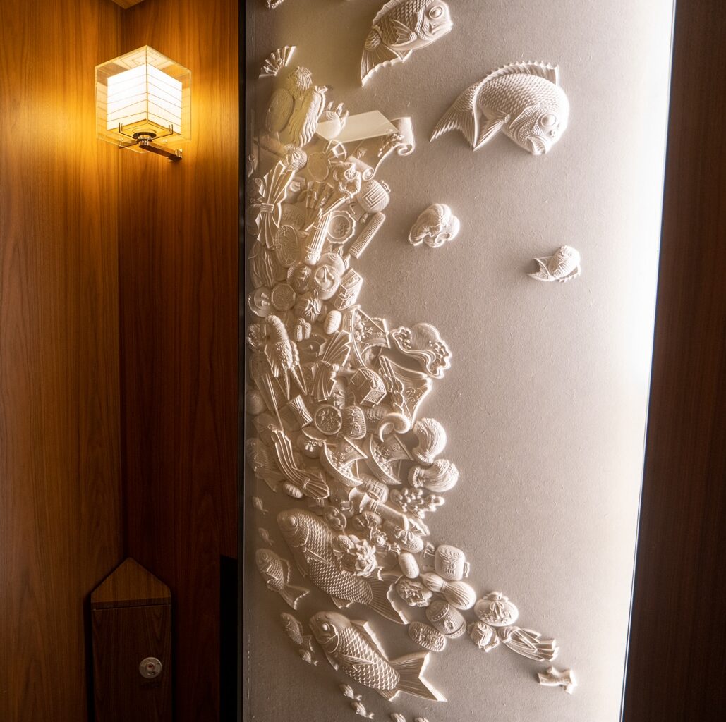 In collaboration with Hyatt, Nagata skillfully incorporated washi art and auspicious motifs such as sea bream, turtles, trains, and cherry blossoms into the interior design of the hotel’s elevators.
