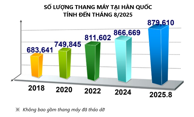 Mở đầu tham luận, ông Hyoung Soon Choi cho biết, tính đến tháng 8/2025, Hàn Quốc đang vận hành 879.610 thang máy. Đáng chú ý, khoảng 90% trong số này là thang chở khách, và gần 70% được lắp đặt tại các khu chung cư và công trình công cộng. Những con số này cho thấy thang máy đã trở thành một bộ phận không thể tách rời của hạ tầng đô thị, gắn bó trực tiếp với sinh hoạt hằng ngày của người dân.