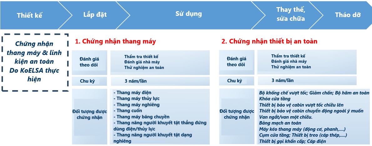 Riêng trong lĩnh vực thang máy, KoELSA được chỉ định là cơ quan COSD, chịu trách nhiệm phát triển, quản lý và cập nhật các tiêu chuẩn quốc gia KS liên quan đến thang máy tại Hàn Quốc. Hiện nay, Hàn Quốc đang quản lý 68 tiêu chuẩn quốc gia KS trong lĩnh vực thang máy,và 45 tiêu chuẩn quốc tế ISO, góp phần xây dựng một môi trường di chuyển an toàn, hiện đại và bền vững cho người dân Hàn Quốc.