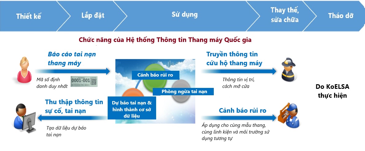 Hệ thống cũng liên tục thu thập dữ liệu về sự cố, tai nạn và lịch sử bảo trì - sửa chữa, từ đó hình thành cơ sở dữ liệu phục vụ phân tích, dự báo rủi ro và cảnh báo sớm. Thông qua quản lý dữ liệu tập trung, KoELSA bảo đảm các hoạt động kiểm định và giám sát an toàn được thực hiện chặt chẽ trong suốt quá trình vận hành thang máy.