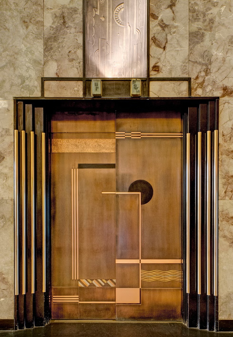 While this method occasionally resulted in pleasing minimalism, it could also make elevators seem adrift from the surrounding architecture, diminishing their capacity to express the building’s spirit and story.