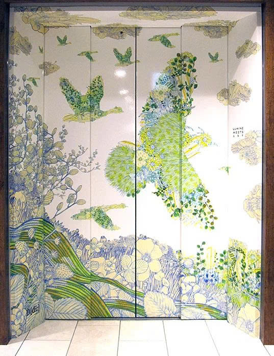 A prime example is the Lumine shopping center in Tokyo. Instead of plain metal elevator cabs, Lumine has transformed the space from lobby to cab into “gallery-like” environments with a mystical, fairytale style. Each elevator here is tied to a story or aspect of Japanese culture, elevating the travel experience into an aesthetic journey while reinforcing the brand identity.