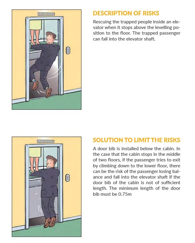 - Breaking the elevator door without confirming the location where the cabin stopped, bringing people out when the cabin is not in a safe zone, thus possibly causing an accident in which someone is crushed or caught by the cabin falling into the shaft, or by falling into the shaft themselves...