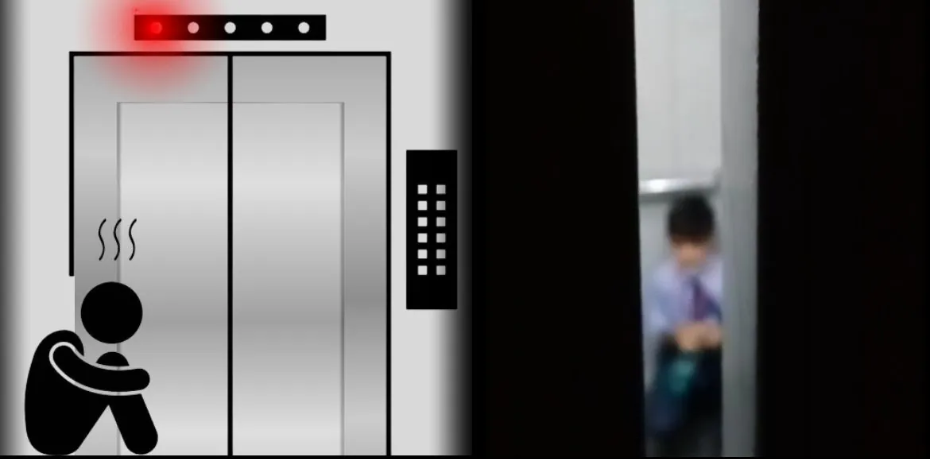 Image of a 10-year-old boy, trapped in an elevator while being rescued in a state of panic