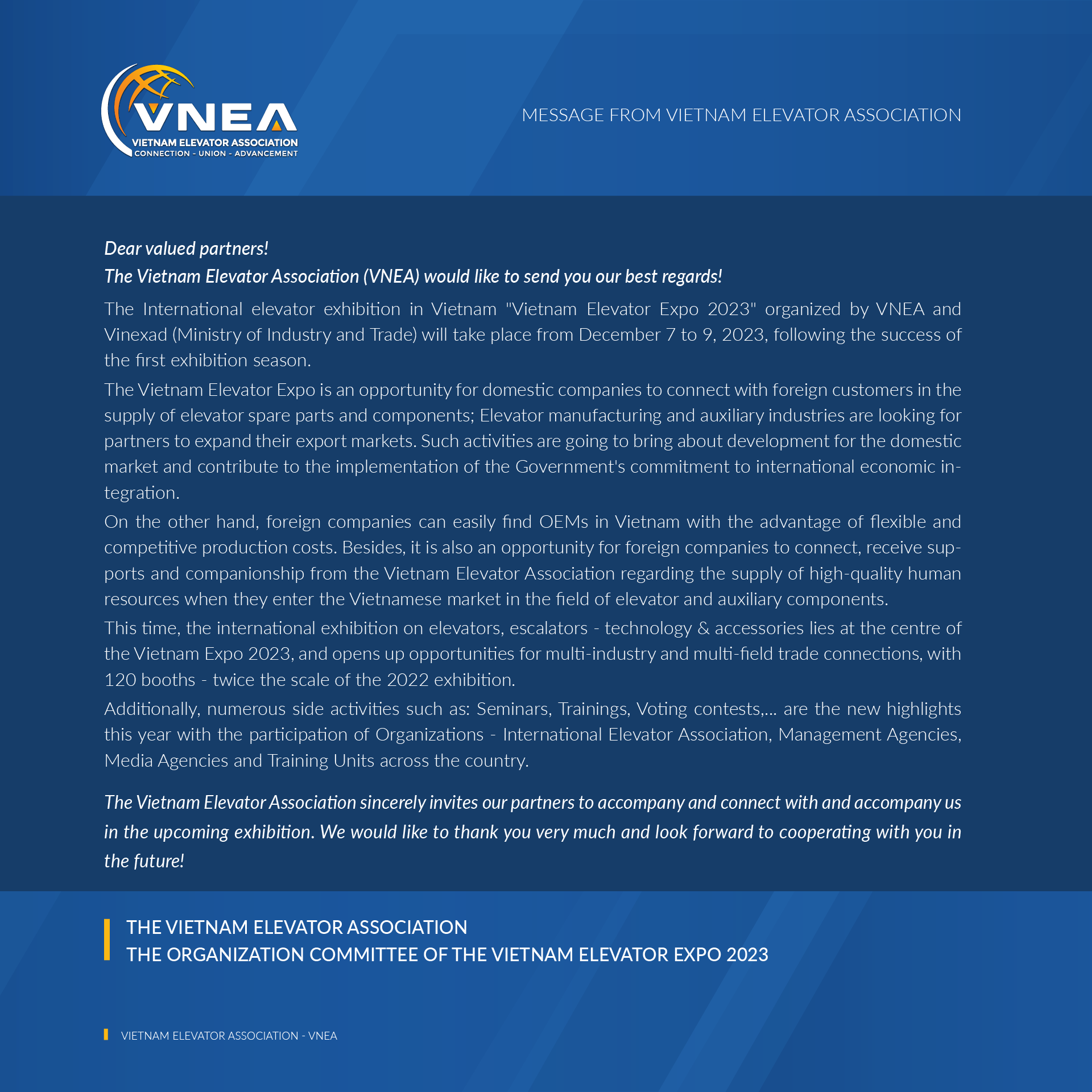 The Vietnam Elevator Association sincerely invites our partners to connect and accompany us in the upcoming exhibition. We would like to thank you very much and look forward to cooperating with you in the future!
