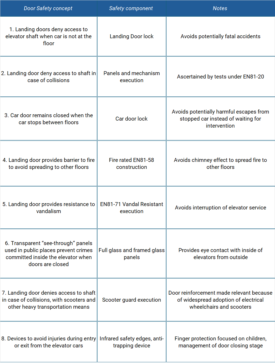 Although most people tend to think about overspeed governors and safety gears when talking about elevator safety, in fact doors are a key element of the safety chain of any elevator (see table below).