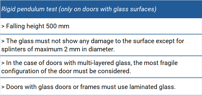 Furthermore, a test with a pendulum is always performed on elevator doors and it is required for certification.