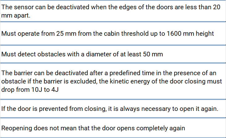 The new EN81-20 rule has introduced new requirements for infrared sensors placed on elevator doors, which are now always required for new elevator installations. Those sensors can detect any object while doors are closing, and they trigger a closing movement stop and the re-opening of the doors to avoid any potential injury to a passenger.