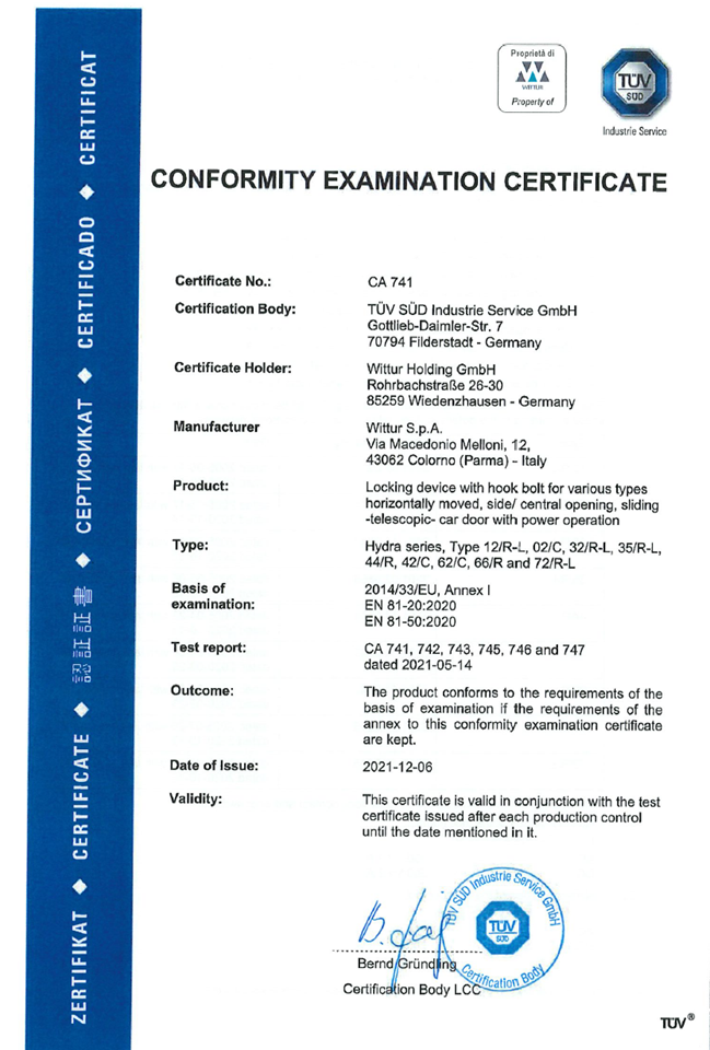 The car door lock being a safety device, it has its own conformity examination certificate, which is integral part of the required certifications for elevator commissioning.