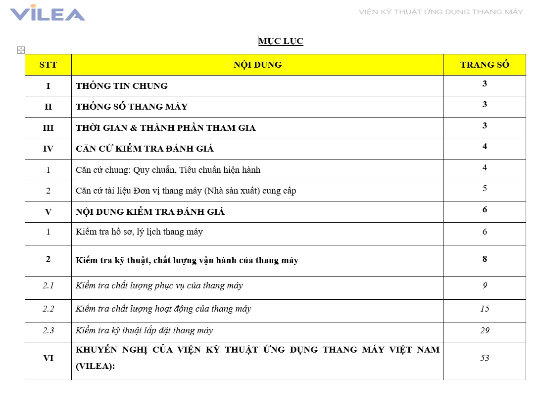 List of basic elevator inspection and assessment contents performed by the Center for Elevator Consulting – Research – Application, under the Vietnam Institute of Lift Engineering Application - VILEA