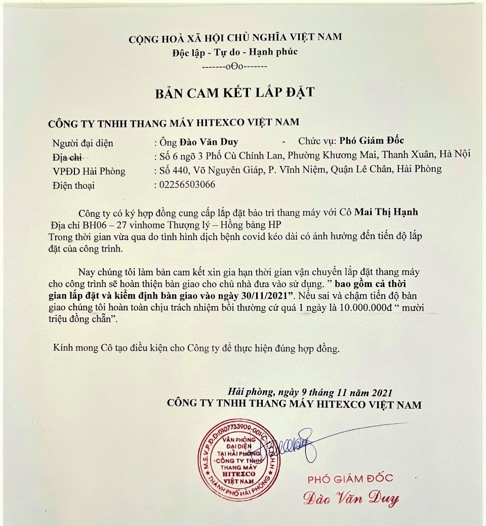 Customer Mai Thi Hanh also added that Mr. Dao Van Duy also wrote a commitment (stamped by Hitexco representative office in Hai Phong), which clearly states that if the handover schedule is delayed, he will be fully responsible and compensation for every 1 day is 10 million VND (!?)