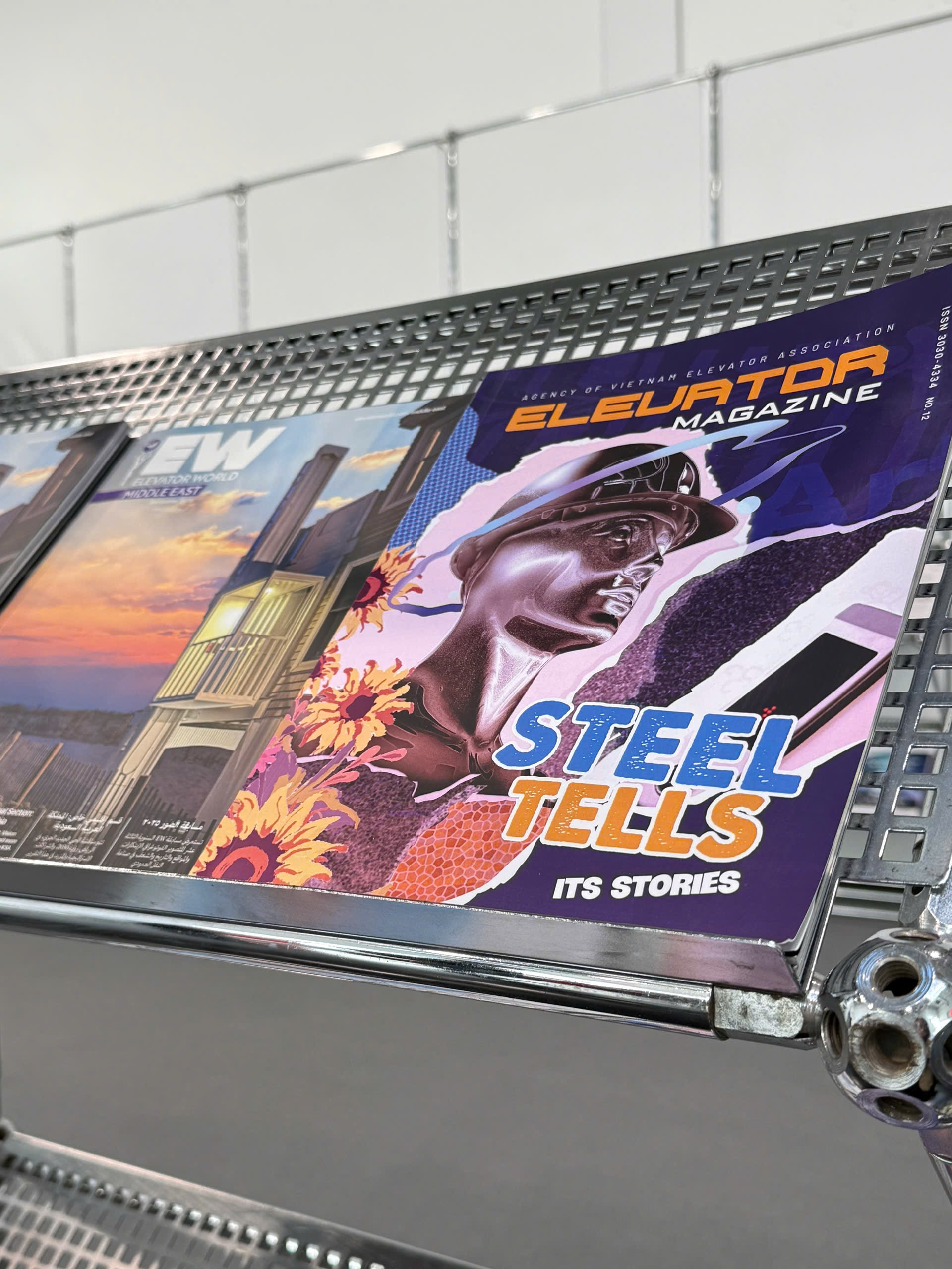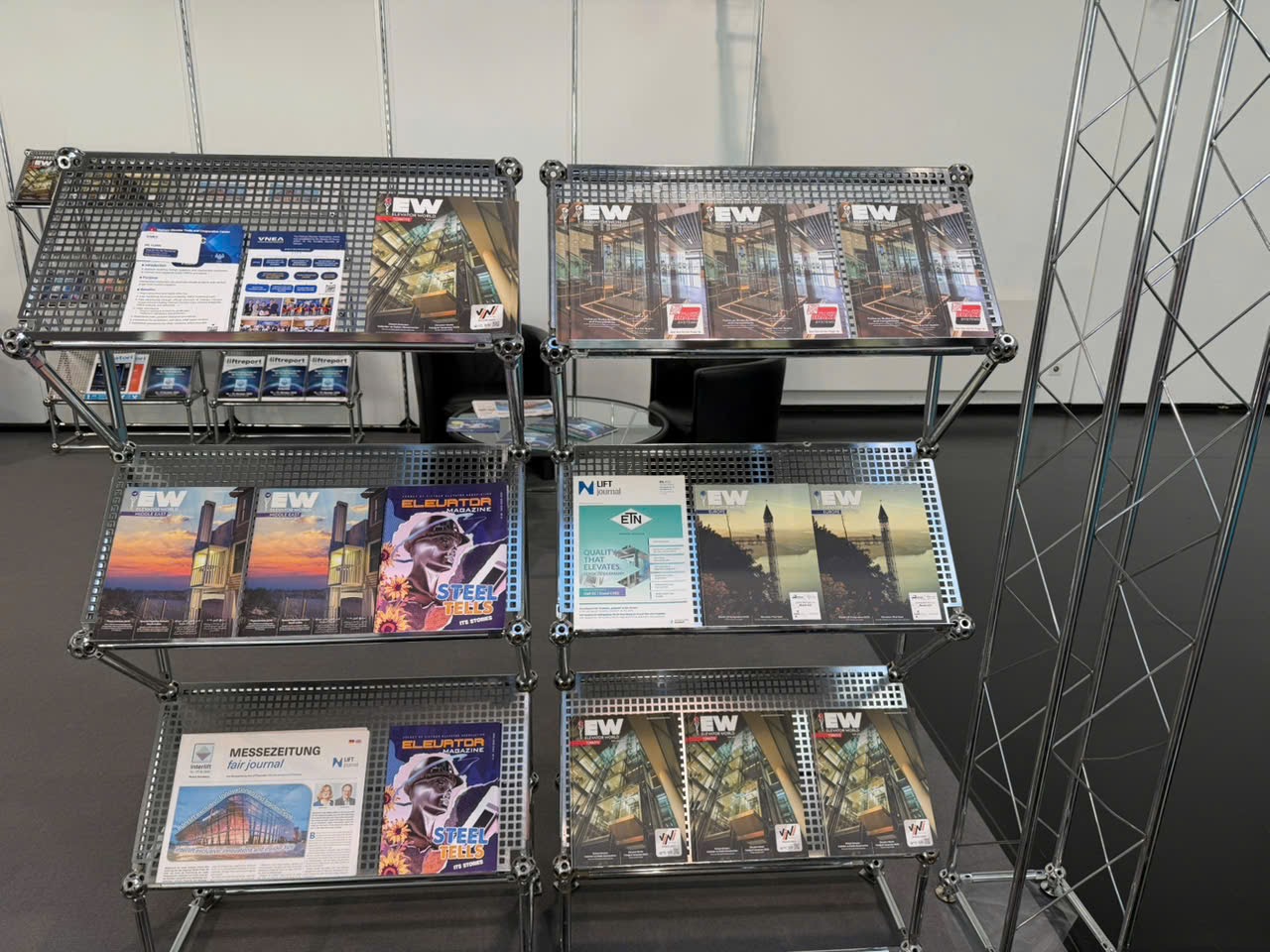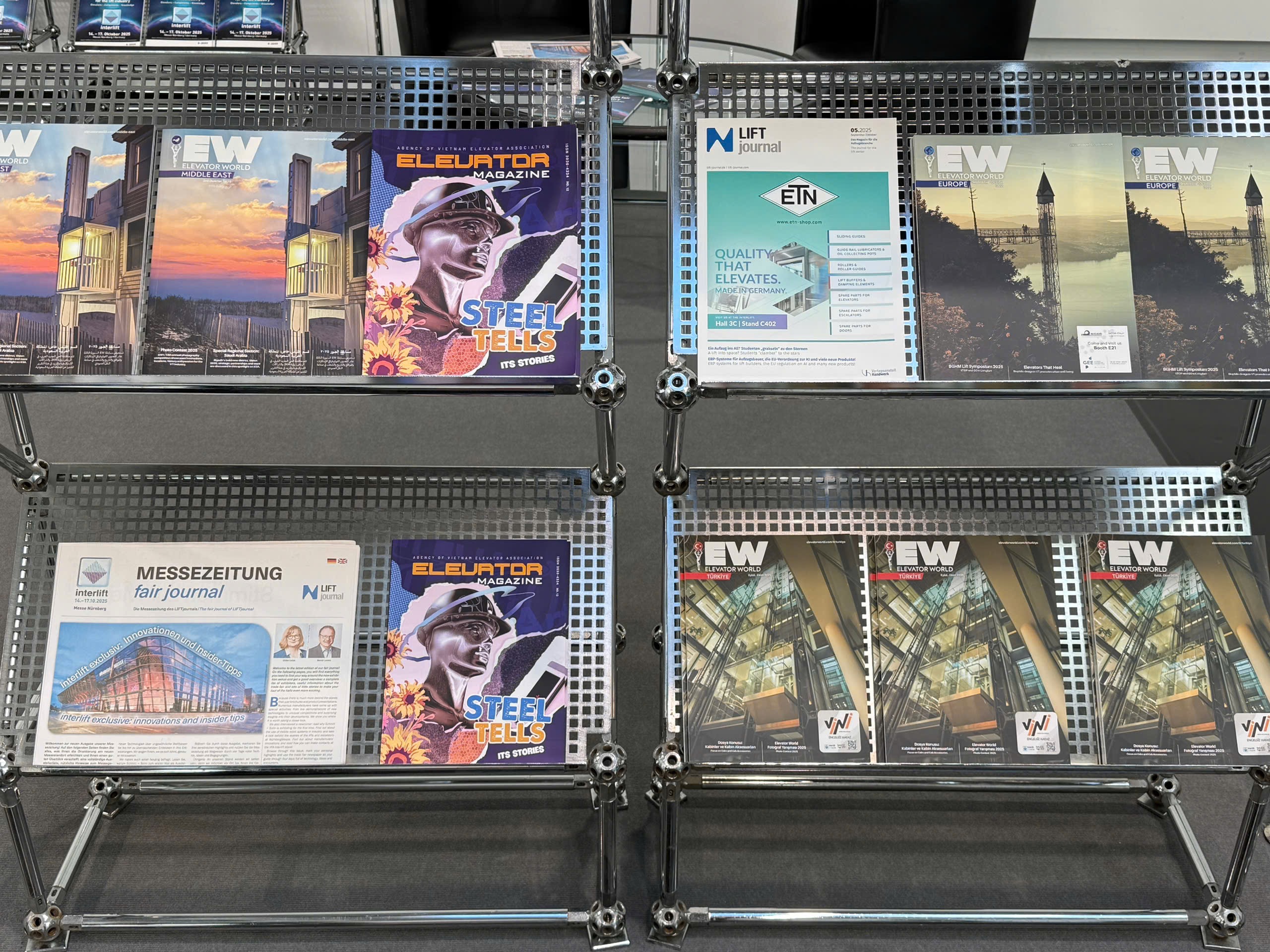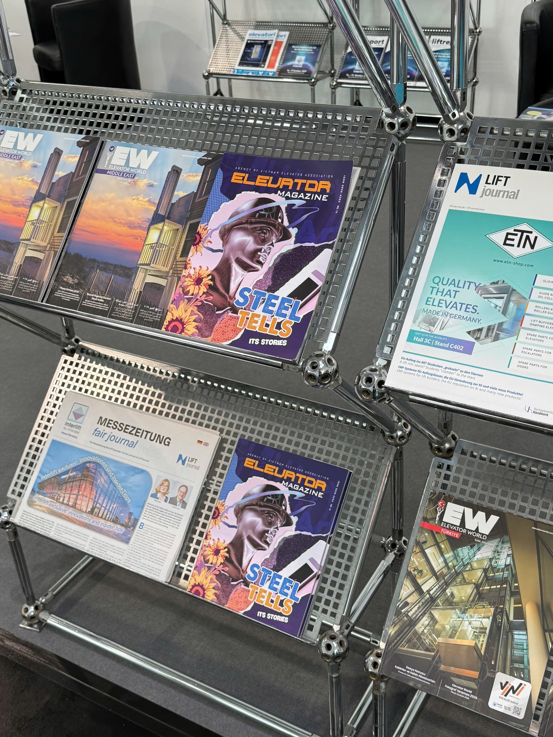 Interlift 2025 also dedicates a special area to elevator industry publications from around the world. Featured titles include Elevator World, Lift Journal, Elevatori, and Vietnam Elevator Magazine, emphasizing the spirit of global information exchange and industry collaboration.