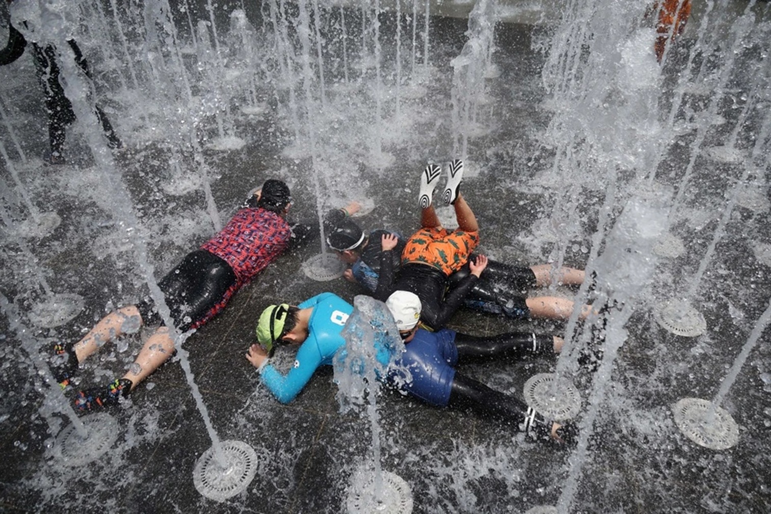 Children in South Korea play in public fountains to escape the heat.