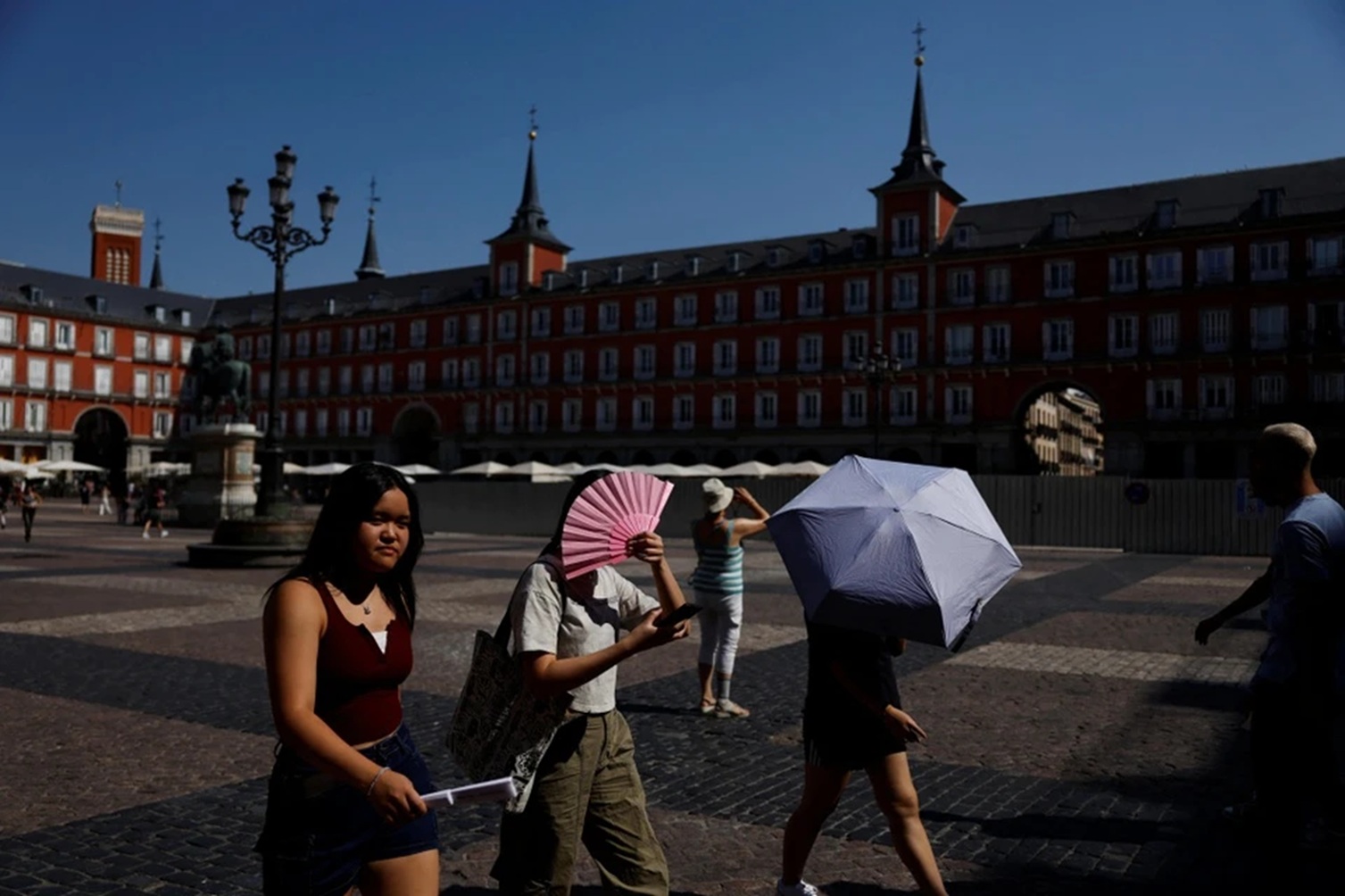 Tourists use umbrellas and hand fans to shade themselves while visiting Plaza Mayor during the intense heatwave in Madrid, Spain, in early August 2025.