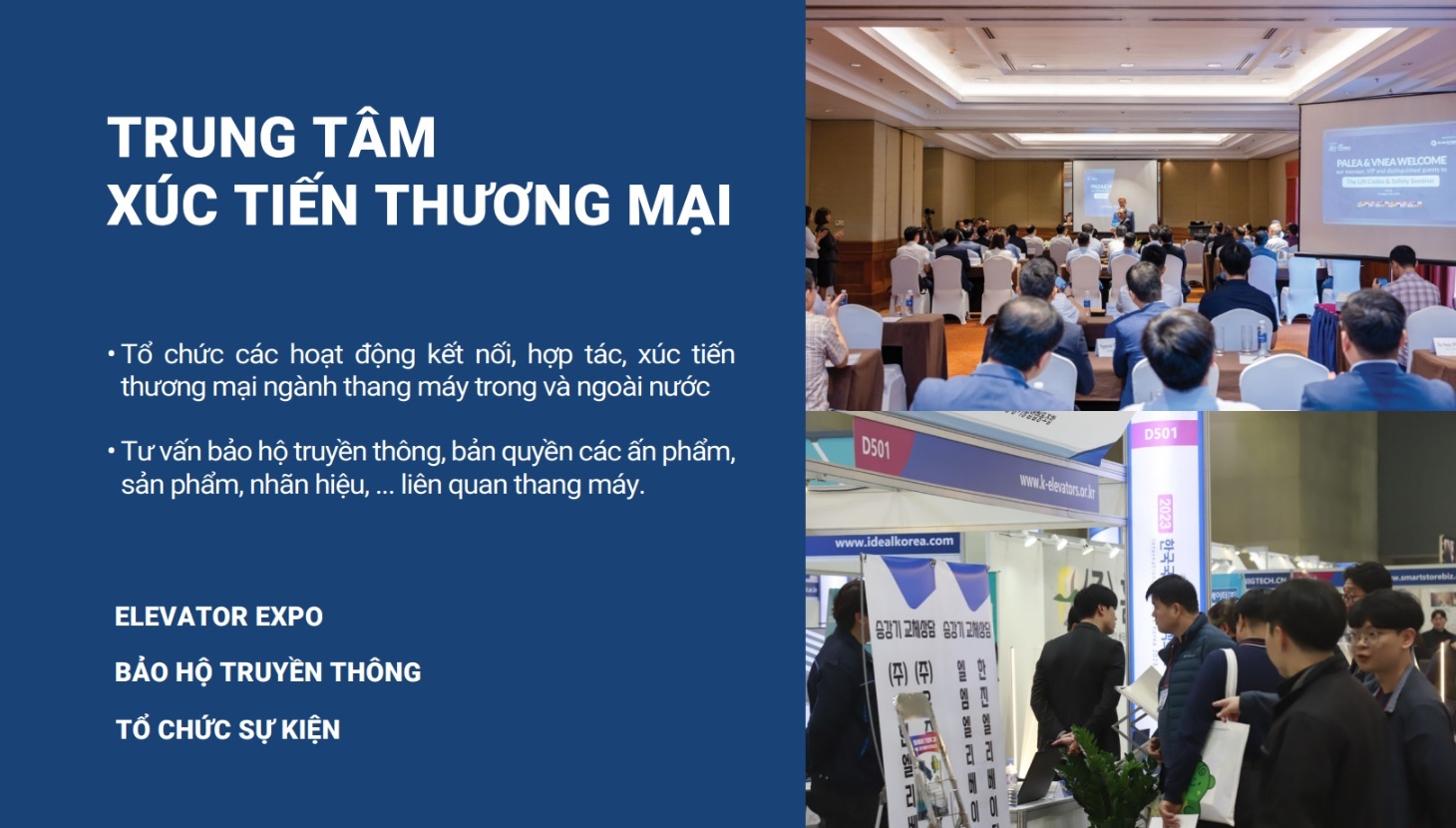 - Dịch vụ khoa học và công nghệ: Tư vấn kỹ thuật, phản biện khoa học; Kiểm định, thử nghiệm, chứng nhận phù hợp tiêu chuẩn, quy chuẩn kỹ thuật trong lĩnh vực thang máy, thang cuốn; Tổ chức các hội nghị, hội thảo khoa học, chuyển giao công nghệ; Đào tạo và tập huấn nâng cao năng lực kỹ năng nghề trong lĩnh vực thang máy, thang cuốn.
