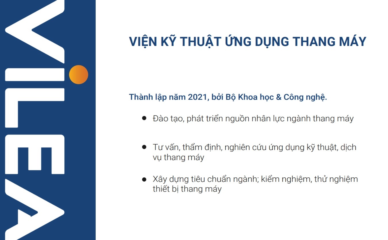 6.2. Viện Kỹ thuật ứng dụng Thang máy - VILEA (được Bộ Khoa học và Công nghệ cấp Giấy chứng nhận hoạt động khoa học và công nghệ tháng 11/2021) thực hiện các nhiệm vụ: