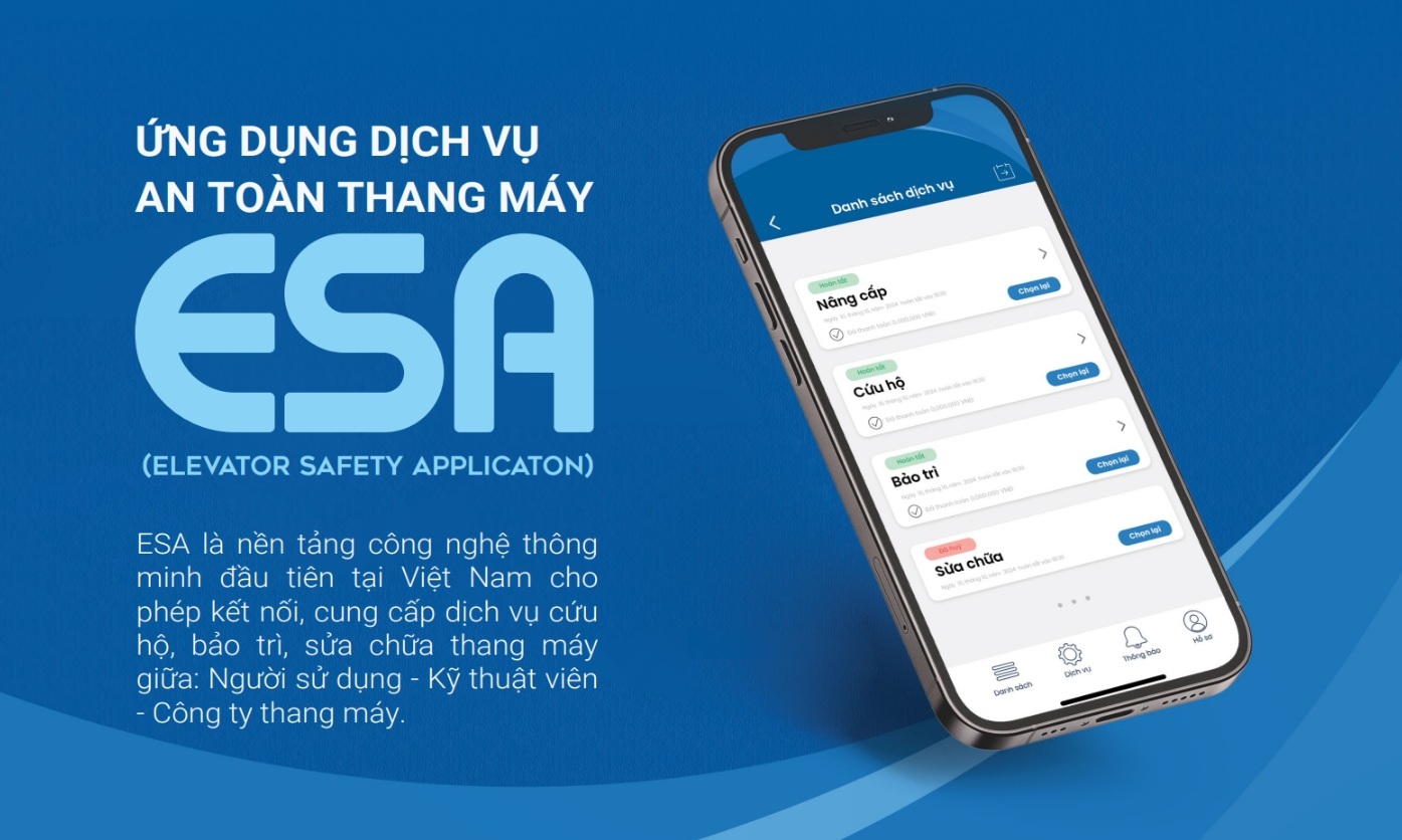 Ứng dụng dịch vụ an toàn thang máy ESA: Đây là nền tảng công nghệ thông minh đầu tiên tại Việt Nam cho phép kết nối, cung cấp dịch vụ cứu hộ, bảo trì, sửa chữa thang máy giữa: Người sử dụng - Kỹ thuật viên - Công ty thang máy. ESA hỗ trợ giám sát doanh nghiệp, đánh giá năng lực kỹ thuật viên, thu thập ý kiến người dân, giúp cơ quan quản lý phát triển chính sách ngành thang máy hiệu quả.