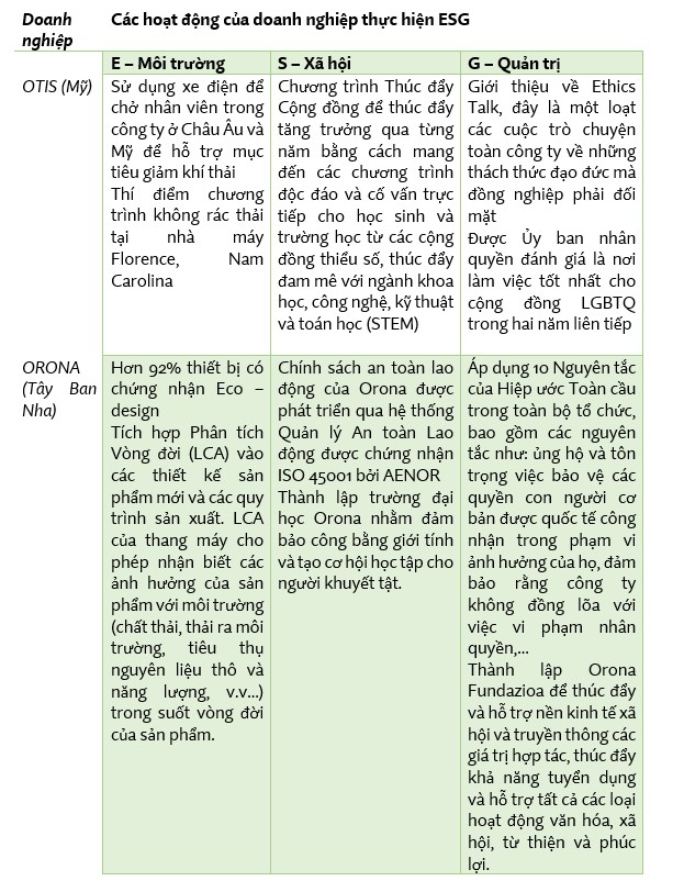 Nhiều doanh nghiệp thang máy đã đưa ESG vào chiến lược kinh doanh của mình. Dưới đây là một số hoạt động cụ thể của một số doanh nghiệp tiêu biểu.