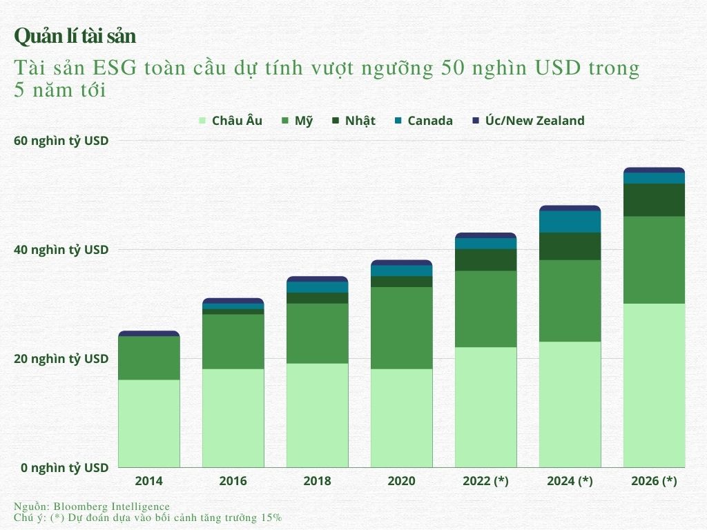 Tài sản ESG toàn cầu có thể vượt qua ngưỡng 50 nghìn tỷ USD vào 5 năm tới – Nguồn: Bloomberg Intelligent