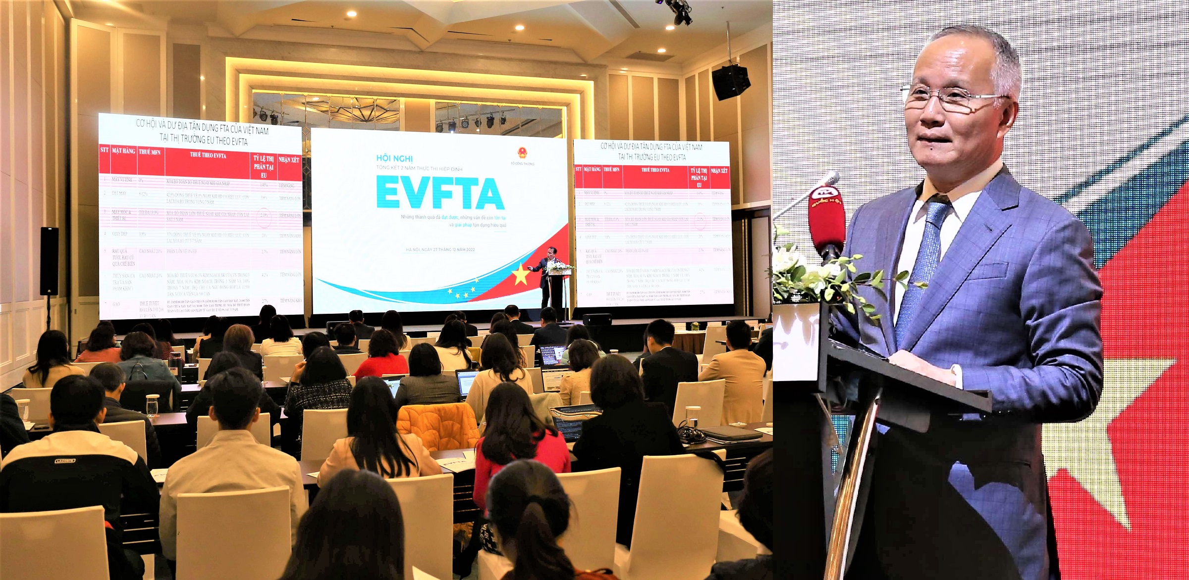 Tại Hội nghị Tổng kết 2 năm thực thi Hiệp định EVFTA, Thứ trưởng Bộ Công Thương Trần Quốc Khánh cho biết, sau hơn 2 năm (1/8/2020-12/2022) thực thi, tăng trưởng xuất nhập khẩu 2 chiều Việt Nam - Liên minh châu Âu (EU) đã đạt được những kết quả đáng khích lệ. Tổng kim ngạch xuất nhập khẩu 2 chiều 11 tháng của năm 2022 giữa Việt Nam và EU đạt trên 57 tỷ USD, trong đó xuất khẩu từ Việt nam sang EU đạt 43,4 tỷ USD.