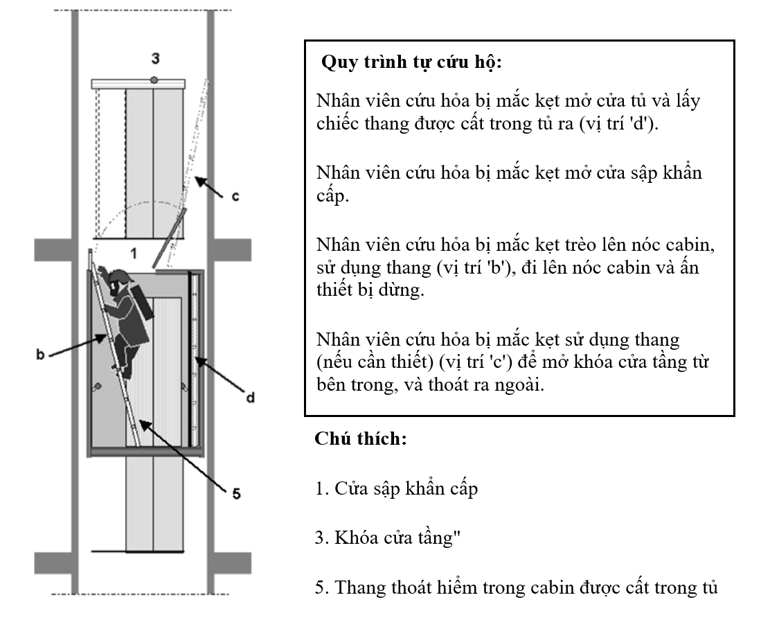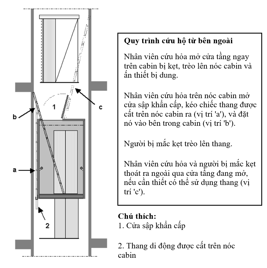 - Nếu cần, sử dụng thang được trang bị bên ngoài cabin (thường đặt trên nóc cabin hoặc bên hông cabin) để tiếp cận và mở khóa cửa tầng từ bên trong giếng thang và thoát ra ngoài.