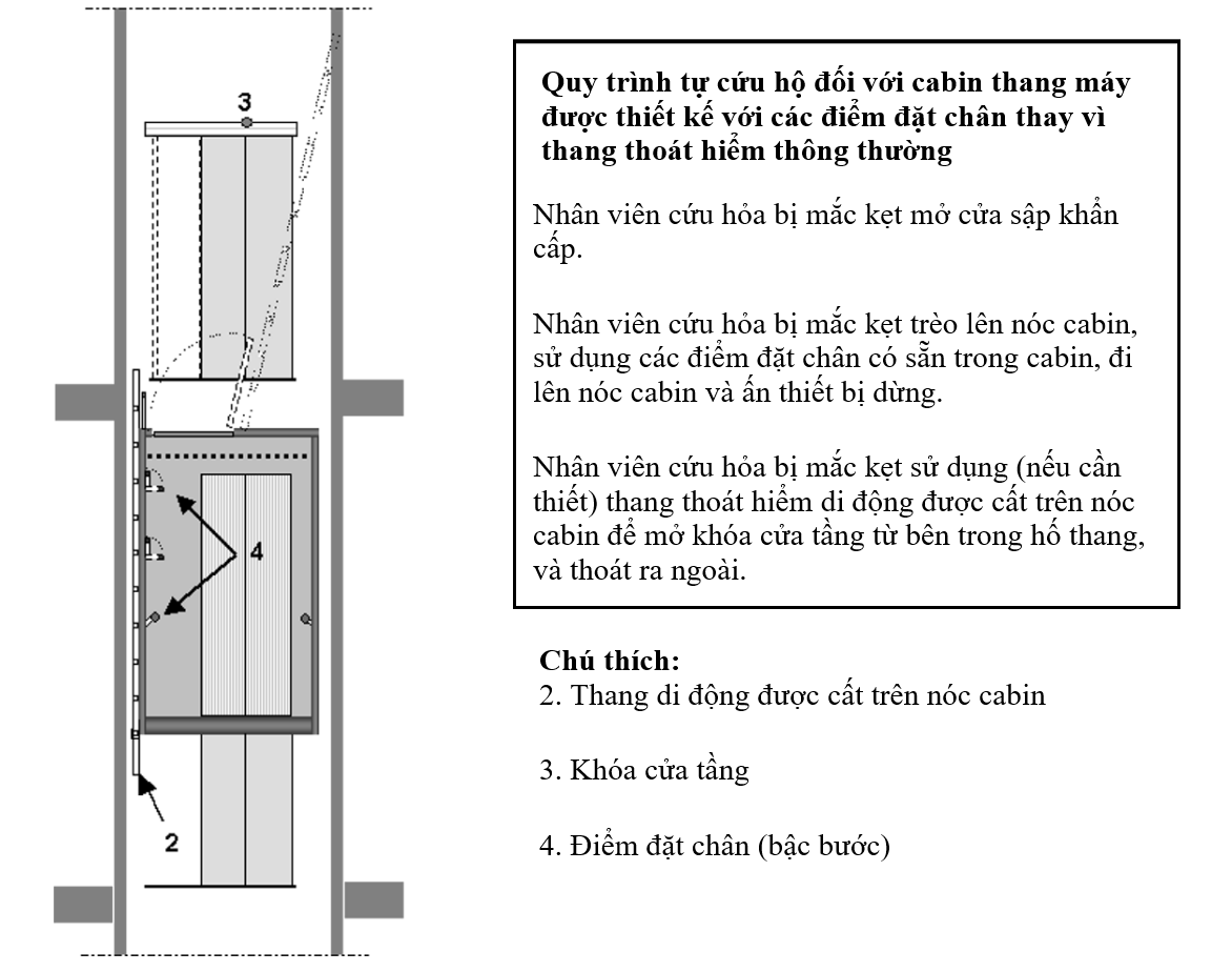 - Trường hợp không lắp thang cứu hộ bên trong cabin, cần phải trang bị bậc leo tại vị trí tiếp cận cửa thoát hiểm nóc cabin.