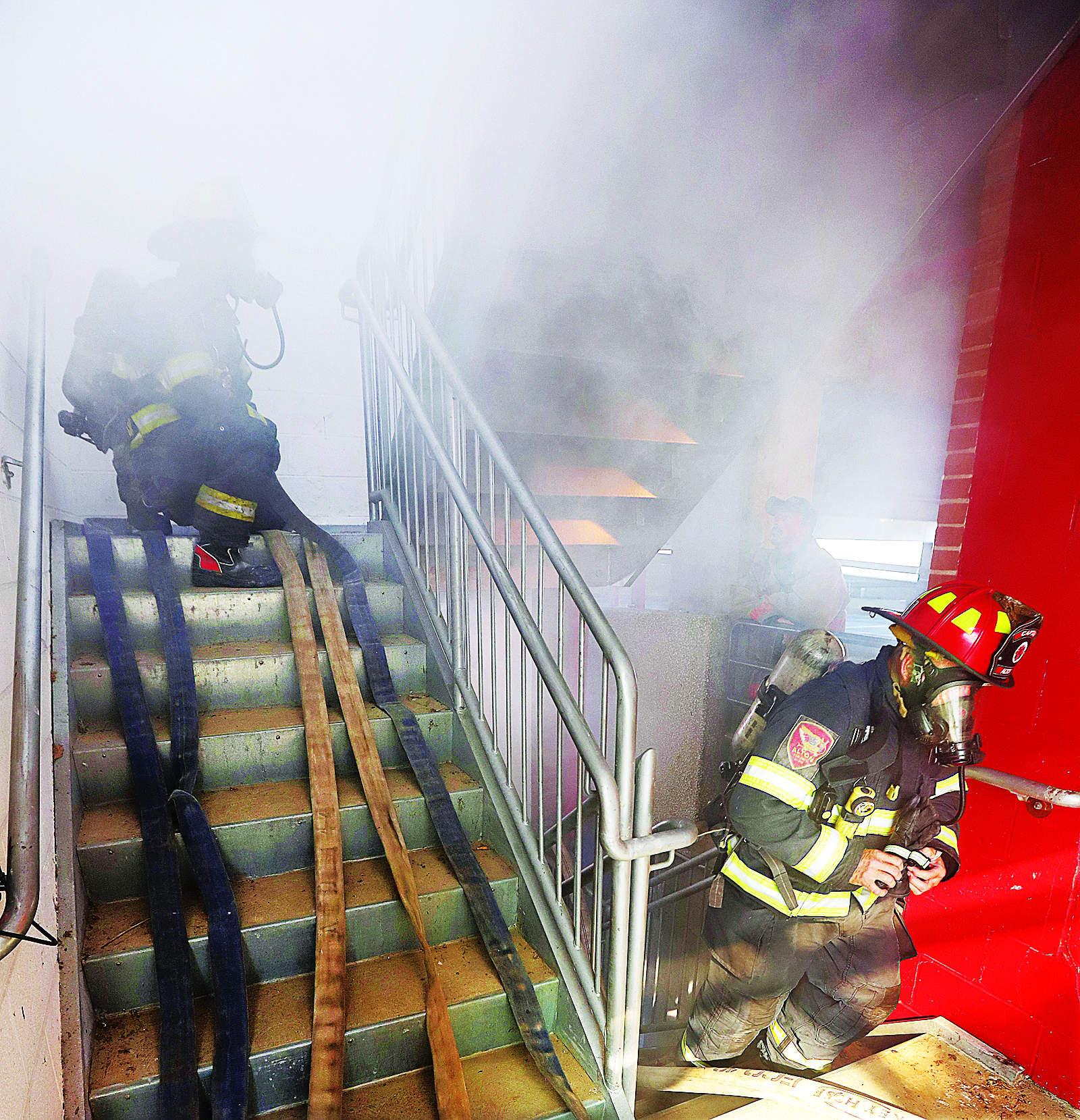 - Lính cứu hỏa và người bị kẹt thoát ra qua cửa tầng đang mở.
