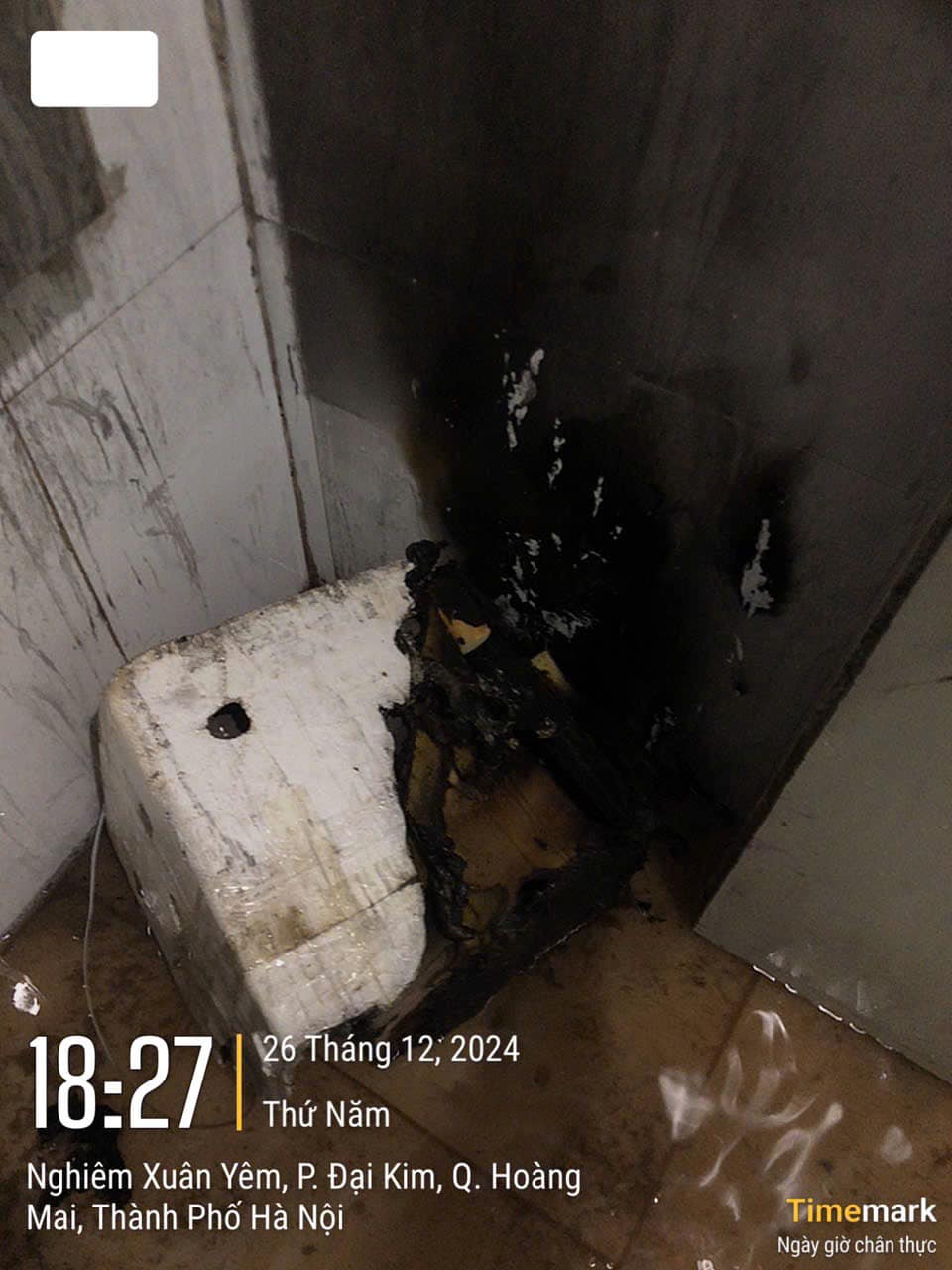 Chiếc thùng xốp trong phòng thu rác tầng 36 tòa CT12A bị đốt cháy (Ảnh: Cư dân chia sẻ).