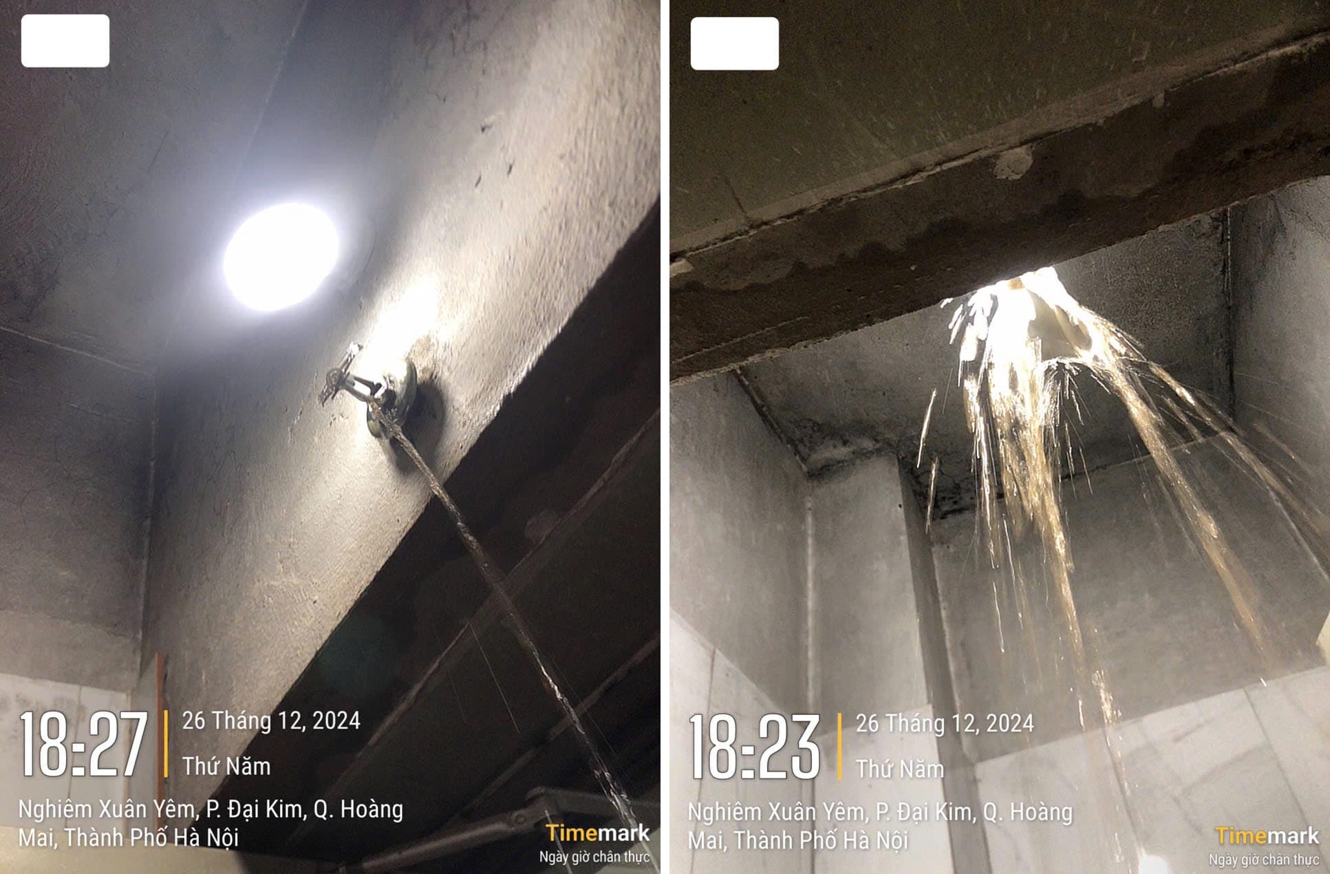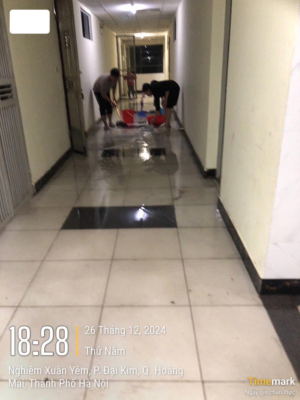 Theo chia sẻ của cư dân, vụ cháy đã khiến đầu vòi cứu hỏa bị vỡ, nước chảy tràn ra ngoài hành lang. Hệ quả là toàn bộ thang tầng cao phải tạm dừng hoạt động. (Ảnh: Cư dân chia sẻ).