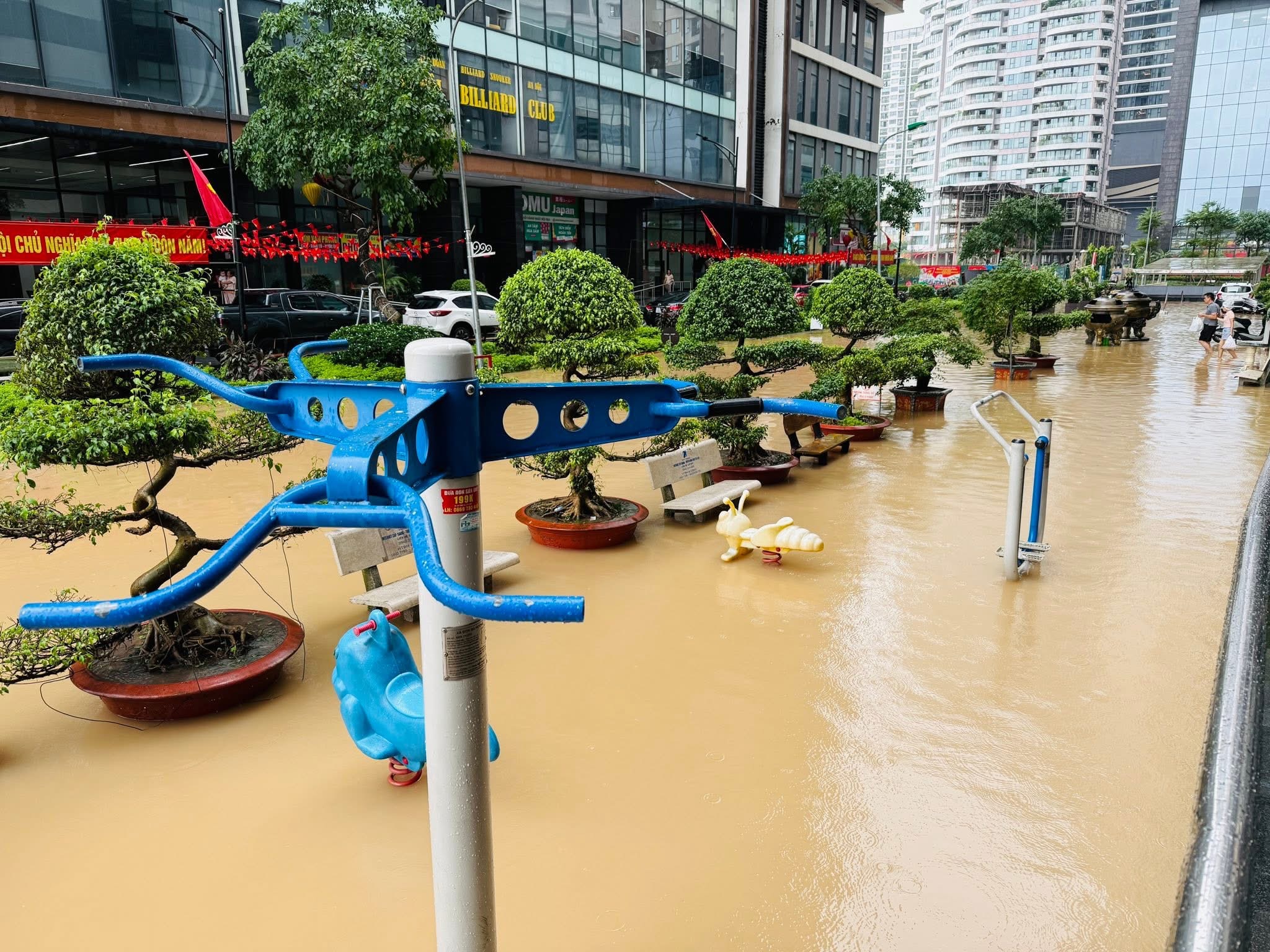 Sau cơn mưa tầm tã suốt đêm và sáng cùng ngày, do ảnh hưởng của hoàn lưu bão Matmo kết hợp hội tụ gió trên cao, nhiều khu vực tại Hà Nội, trong đó có khu Ngoại Giao Đoàn, rơi vào tình trạng ngập cục bộ. Nhiều tuyến đường nội khu biến thành “sông”, nước dâng đến đầu gối khiến việc đi lại và sinh hoạt của cư dân bị đảo lộn.