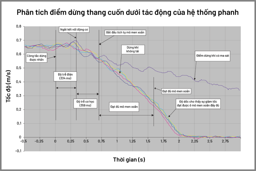 Có thể thấy, thời gian dừng (từ thời gian mà công tắc dừng được nhấn cho đến khi thang cuốn dừng hẳn) là khoảng 2 giây. Thời gian dừng này bao gồm độ trễ điện (khoảng 350ms), độ trễ cơ học (khoảng 360ms), tích lũy mômen xoắn phanh (khoảng 890ms), và thời gian dừng cuối cùng dưới mômen phanh (khoảng 400ms)
