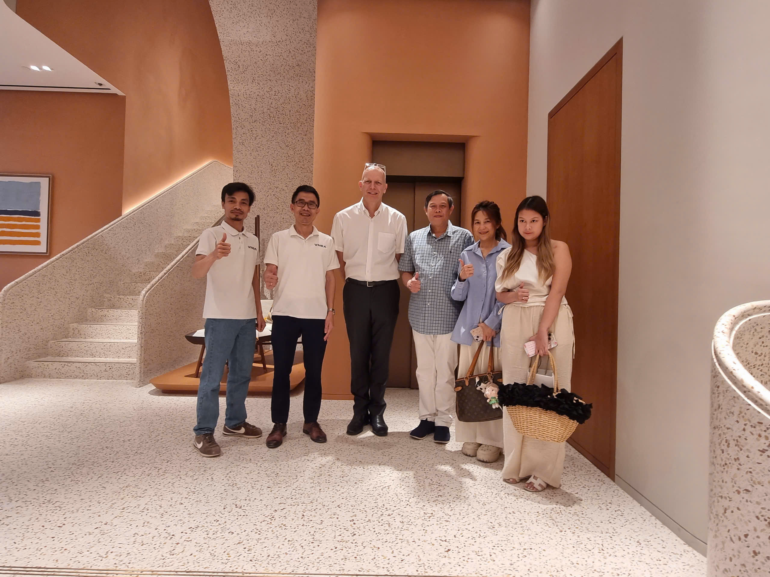 Đoàn chuyên gia của VNEA và GamaLift chụp ảnh lưu niệm cùng Đại diện Hermès Central Embassy và Đại diện Thang máy Orona tại Thái Lan