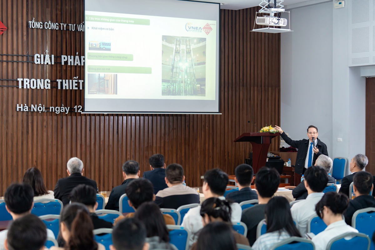 Tại hội thảo, ông Nguyễn Huy Tiến – Tổng Thư ký Hiệp hội Thang máy Việt Nam, đã chia sẻ tổng quan kiến thức chung về thang máy cùng nhiều kinh nghiệm thực tế, giúp đội ngũ tư vấn thiết kế nâng cao năng lực chuyên môn và ứng dụng hiệu quả giải pháp thang máy trong các dự án hiện đại.