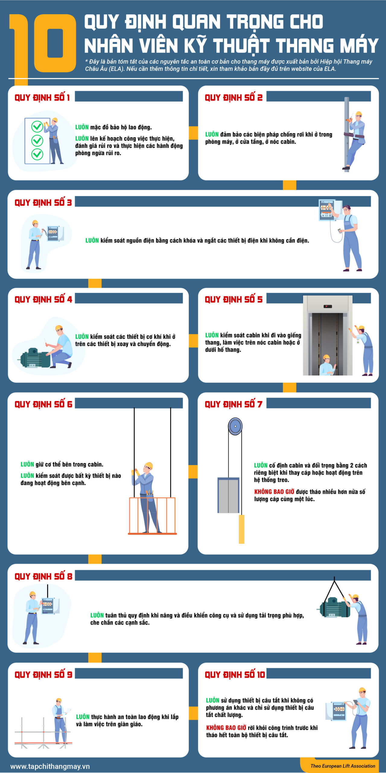 Về quy định chi tiết, xin tham khảo bản đầy đủ tại: Basic Safety Practices for Lifts (European Lift Association).