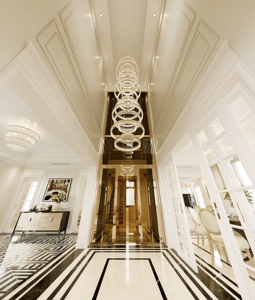 The elevators that combine luxurious wood materials with panoramic car walls to create an open space or the impressive texture designs all create their own style in harmony with the shared space of the house, even being a highlight.