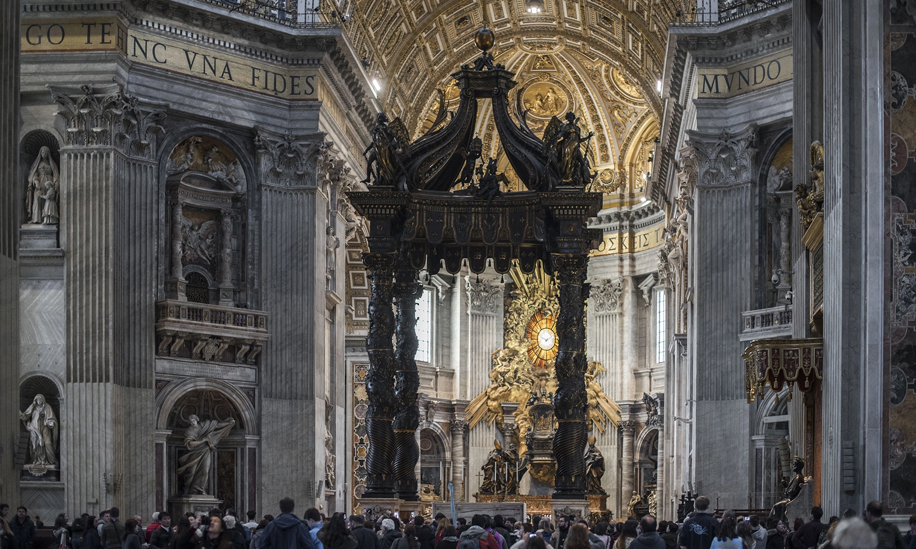 Mái che bằng đồng bên trong Nhà thờ Thánh Phêrô do hai nghệ sĩ Italy Gian Lorenzo Bernini và Borromini thiết kế, được chế tạo từ 1623 đến 1634. Phần mộ Thánh Phêrô được cho là nằm dưới mái che cao 30 m này.