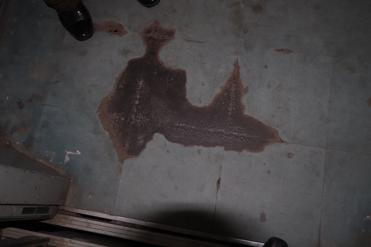 Sàn cabin thang máy đã bị hoen rỉ do nước bẩn, chất thải