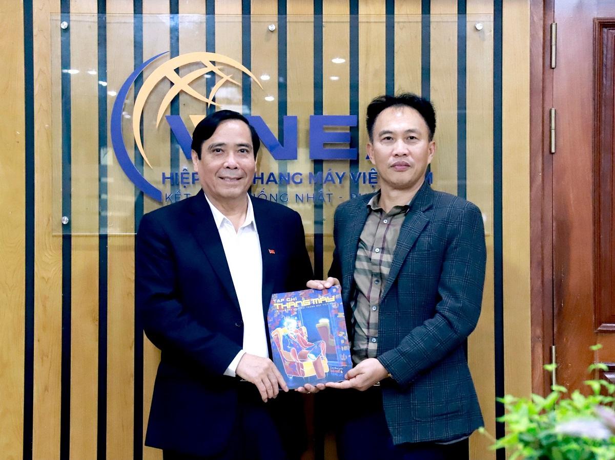 Chủ tịch Hiệp hội Thang máy Việt Nam Nguyễn Hải Đức (bên phải) tặng Chủ tịch Hội Người cao tuổi Nguyễn Thanh Bình ấn phẩm Tạp chí Thang máy