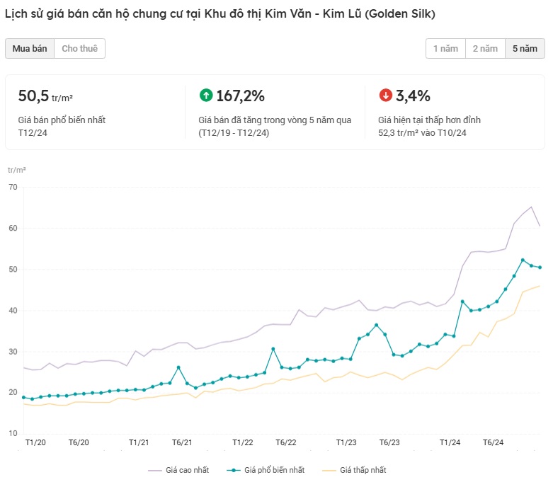 Mặc dù liên tiếp xảy ra sự cố, ảnh hưởng không nhỏ tới cuộc sống sinh hoạt cư dân nhưng theo khảo sát, giá căn hộ tại Khu đô thị Kim Văn - Kim Lũ đã rao bán lên đến 50,5 triệu đồng/m2. Mức giá này đã giảm nhẹ 3,4% so với đỉnh 52,3 triệu đồng/m2 vào tháng 10/2024, nhưng vẫn cao gấp gần 3 lần so với mức 18,5 triệu đồng/m2 vào tháng 1/2020.