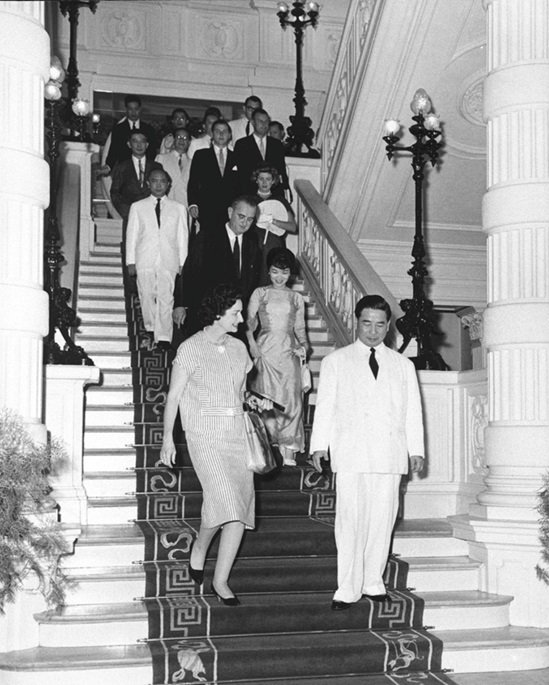 Ngô Đình Diệm tiếp Phó Tổng thống Hoa Kỳ L. Johnson (hàng 3, áo vest đen) năm 1961 hội đàm tại Dinh Độc Lập