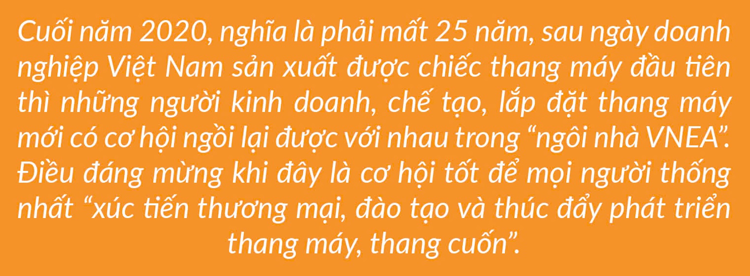 Cuối năm 2020, nghĩa là phải mất 25 năm, sau ngày doanh nghiệp Việt Nam sản xuất được chiếc thang máy đầu tiên thì những người kinh doanh, chế tạo, lắp đặt thang máy mới có cơ hội ngồi lại được với nhau trong “ngôi nhà VNEA”. Điều đáng mừng khi đây là cơ hội tốt để mọi người thống nhất “xúc tiến thương mại, đào tạo và thúc đẩy phát triển thang máy, thang cuốn”.