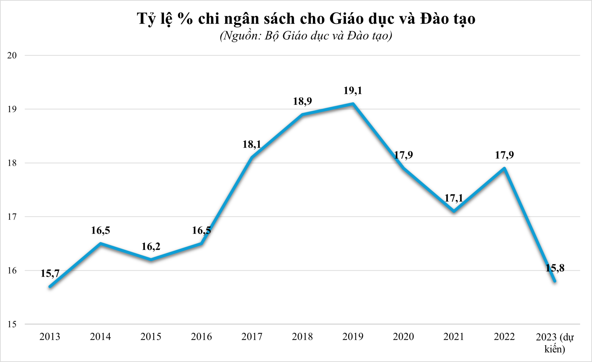Song song với đầu tư cho khoa học và công nghệ, trong 10 năm qua, ngân sách chi cho giáo dục và đào tạo của Việt Nam cũng chỉ ở mức 15,7-19,1%, chưa năm nào đạt mức tối thiểu 20% theo Nghị quyết 29 về đổi mới giáo dục đề ra năm 2013.