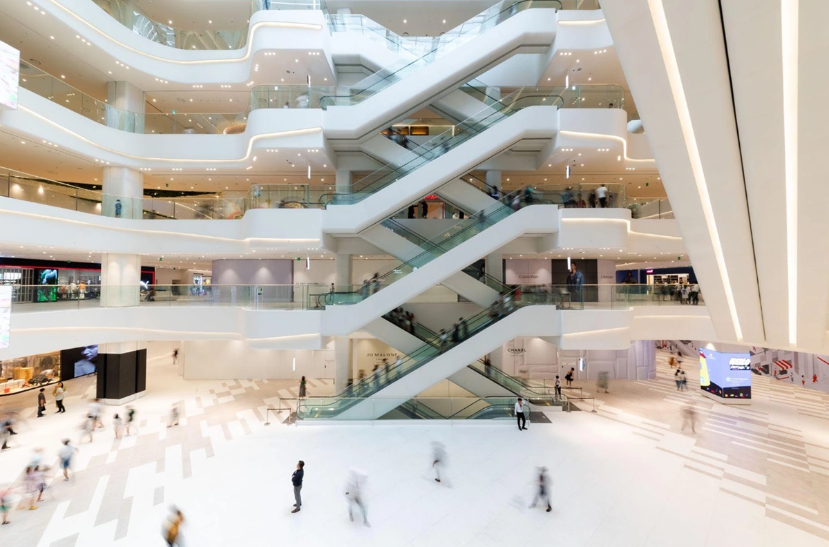 Thang cuốn cho trung tâm thương mại chịu tải nhẹ hơn nhưng yêu cầu cao về độ êm ái, thoải mái. Trong hình: Hệ thống thang cuốn tại Trung tâm Thương mại Lotte Mart Tây Hồ