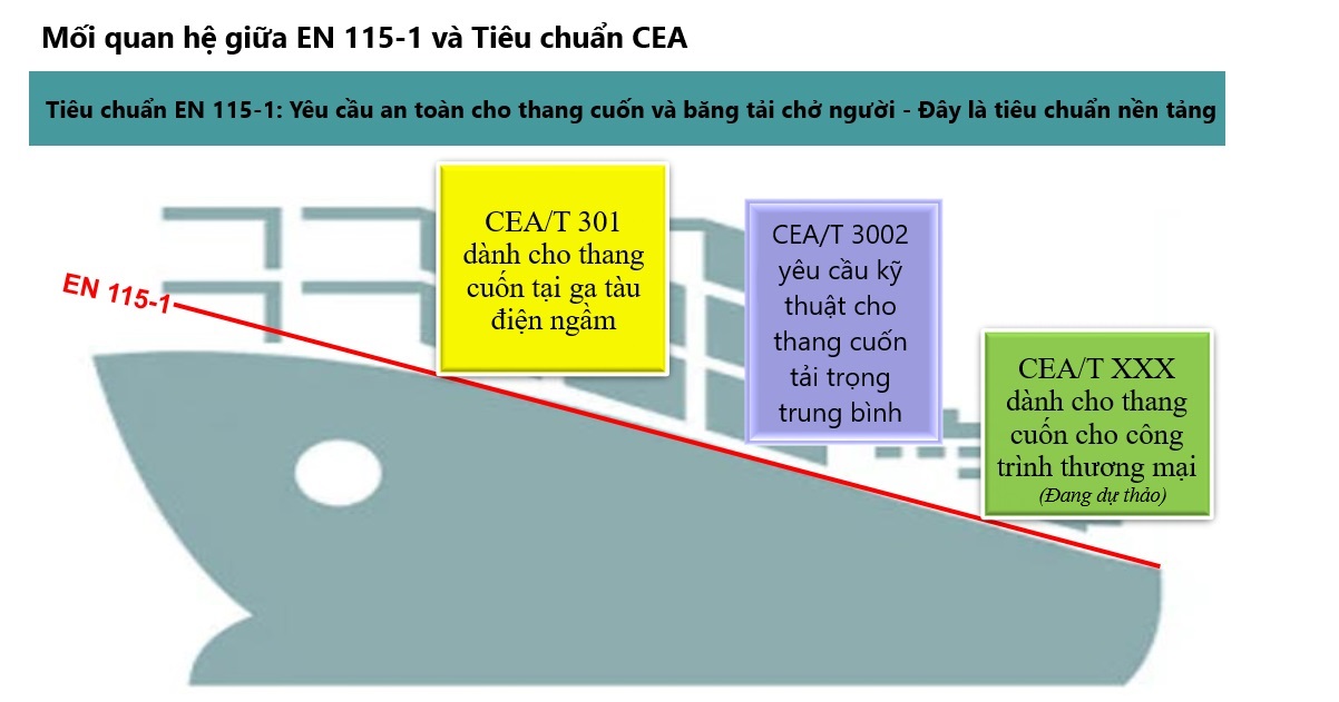 Các Tiêu chuẩn của CEA liên quan tới thang cuốn và băng tải trở người đều lấy Tiêu chuẩn Châu Âu EN 115-1 làm nền tảng