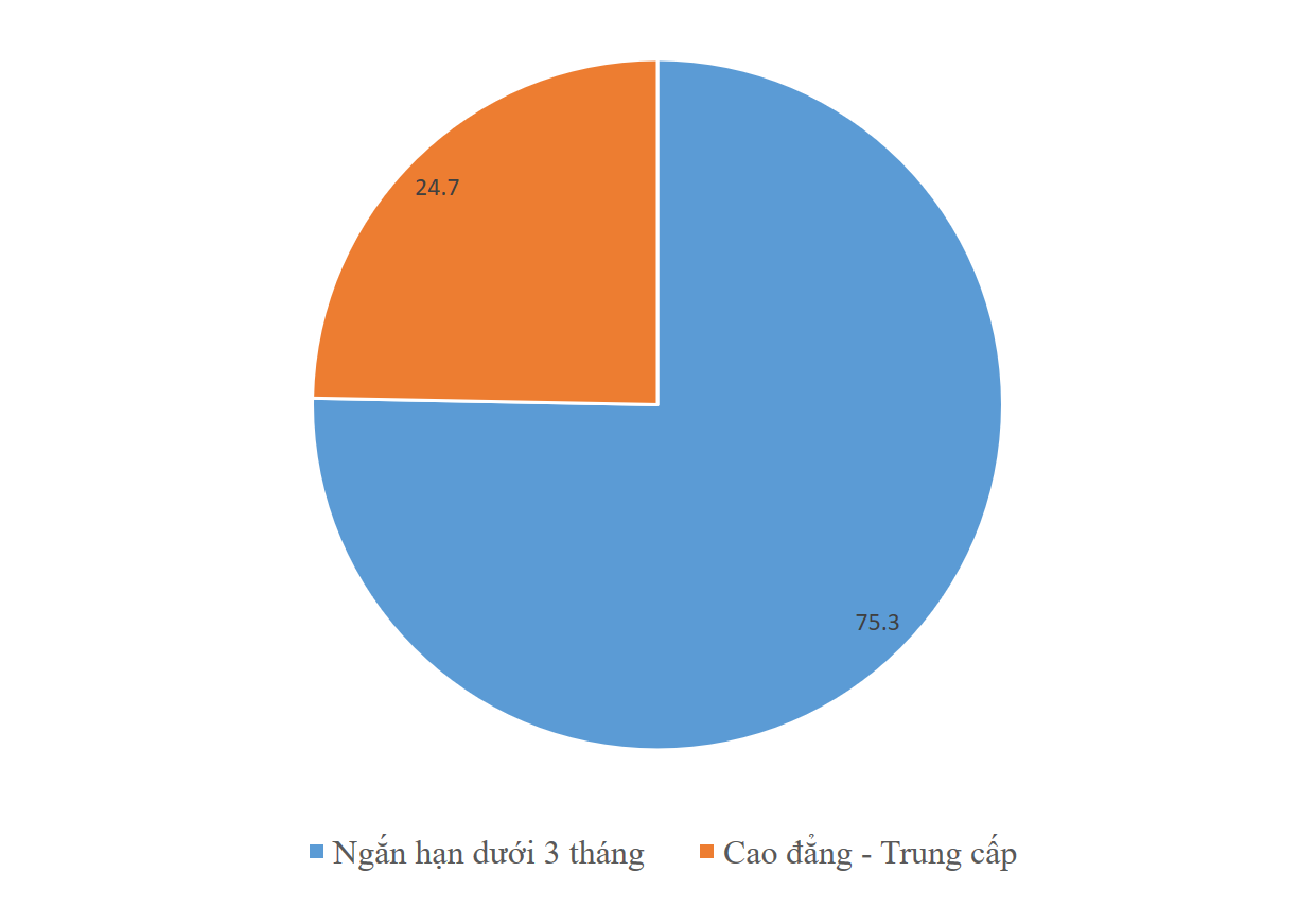 Cụ thể, việc tuyển sinh giáo dục nghề nghiệp chủ yếu vẫn là sơ cấp, các hình thức đào tạo dưới 3 tháng chiếm 75,3%, còn lại là cao đẳng và trung cấp khoảng 24,7%.
